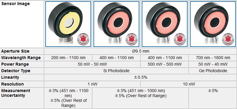 M520 幾乎與所有的功率和能量探頭相兼容(光電探頭,熱敏探頭,熱釋電探頭),應(yīng)用于從紫外到中紅外波段的檢測(cè)。它將光電探頭(超薄型, 積分球型, 光纖型)輸出電流從10 pA到5 mA間劃分了6個(gè)量程,對(duì)熱敏探頭的熱電電壓從100 nV到1 V劃分為4個(gè)量程,兩者都可自動(dòng)或手動(dòng)設(shè)置。表頭對(duì)熱釋電探頭的電壓從100 μV 到100V有4個(gè)手動(dòng)可調(diào)量程,觸發(fā)電平可調(diào)節(jié),范圍從0.1%到99.9%。 用戶可以使用定制的探頭,并上傳一個(gè)響應(yīng)曲線來進(jìn)行光譜響應(yīng)校正。此外該表頭還配有一個(gè)USB2.0接口可用于遠(yuǎn)程連接控制。以下概述了所有兼容的探頭和適配器。