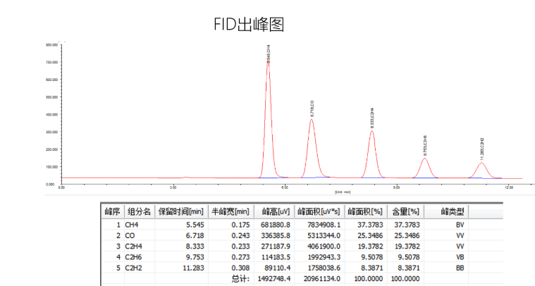 以氬氣為載氣前裝置六通閥進樣經(jīng)色譜儀六通閥相連的預處理柱進行分離,在氫氣,氧氣,氮氣,甲烷,一氧化碳進入5A分子篩柱而CO2未出預處理柱前六通閥反吹出的二氧化碳及碳、乙烯、丙烷等進入FID2充檢測柱,由FID2測器檢出碳二碳三烴烷類,而經(jīng)5A柱分離的氫氣,氧氣,氮氣,甲烷,一氧化碳進入TCD檢測器,檢出氫氣,氧氣,氮氣;樣品氣再經(jīng)轉(zhuǎn)化爐進FID檢出甲烷,一氧化碳。另一路經(jīng)RB-WAX毛細FID1檢出醇、醛、酸等液態(tài)產(chǎn)物。
