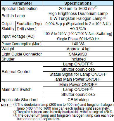 通過(guò)使用安裝在同一外殼內(nèi)的高亮度氘燈和鹵鎢燈,該光源能通過(guò)光波導(dǎo)(單賣(mài))輸出200nm到1600nm的光。輸出的光強(qiáng)大約是現(xiàn)有型號(hào)的兩倍。緊湊的尺寸和較輕的重量使其易于攜帶。機(jī)械快門(mén)和外部控制等實(shí)用的功能使其易于使用。這種新型光源同時(shí)適用于多種型號(hào)的便攜式設(shè)備。