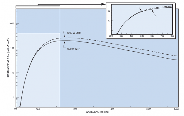 The Light Source uses different power lamps as its illumination source. This Tungsten Halogen lamp exhibit better output stability than arc lamps and do not produce strong UV light emission or toxic ozone. Their smooth spectral output curve make them useful for radiometric and photometric applications.
