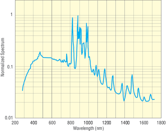 The XE100 uses the 6002 100 W Ozone Free Xe lamp as its illumination source. Xe arc lamps produce a spectral output curve that is almost featureless in the UV and NIR regions, with characteristic Xe lines emitted from 750-1000 nm. Due to their sun-like emission spectrum, Xe lamps are widely used for solar simulation applications. Their high intensity, broadband output also make them popular excitation sources for absorbance and fluorescence applications. The 6002 is an Ozone Free Xe lamp, useful for applications that do not require wavelength emission below 260 nm and features an ellipsoidal reflector to maximize light throughput throughout the 100 W Xe Light Source.