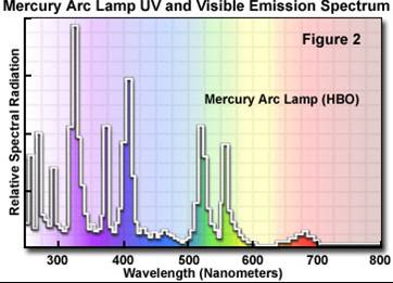 氙燈和汞燈做為白光源,都能提供從紫外到近紅外一系列波長(zhǎng)的光,但它們卻有著不同的激發(fā)光譜。汞燈集中在近紫外、藍(lán)光以及綠光附近,這種在峰值的高激發(fā)能量確保產(chǎn)生明亮的熒光信號(hào),但光毒性卻很強(qiáng)。因此,HBO用來(lái)對(duì)固定樣品或弱熒光成像。相比而言,氙燈光源的激發(fā)比較平緩,可以用于不同波長(zhǎng)間強(qiáng)度的比較,例如用于鈣離子濃度測(cè)量等。氙燈的強(qiáng)激發(fā)在近紅外800-1000nm。