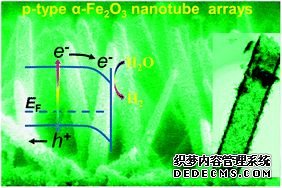 中科院理化所師文生課題組在具有ZnO陣列的FTO上,用電沉積的方式制備了FeOOH,通過高溫離子擴(kuò)散的方式使Zn2+摻雜入Fe2O3, 后去除ZnO模板獲得了p型Zn2+摻雜Fe2O3的空心納米管光陰,并展現(xiàn)出了較高的開啟電勢(shì)。(上圖,DOI:10.1039/C3CC40599K)