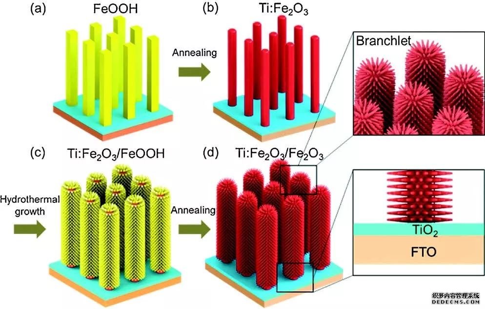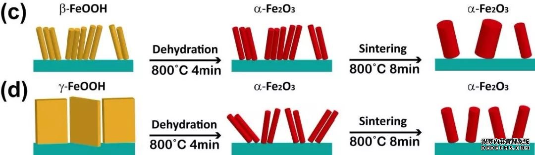 Yilin Liu等發(fā)現(xiàn) FeOOH的晶相結(jié)構(gòu)會(huì)對(duì)煅燒過程有影響:當(dāng)FeOOH 為緊密堆積的β相時(shí),煅燒過程中納米棒會(huì)燒結(jié),終得到的Fe2O3納米棒會(huì)比較粗(約65nm);而當(dāng)FeOOH為層狀結(jié)構(gòu)的γ相時(shí),煅燒過程中結(jié)構(gòu)會(huì)脫水?dāng)嗔,能生成超?xì)結(jié)構(gòu)的納米棒(約20 nm) ,其光電流相比于直徑較粗的Fe2O3,也有了1.5 倍的提升。(上圖,DOI:10.1088/1361-6463/aa6fb7)