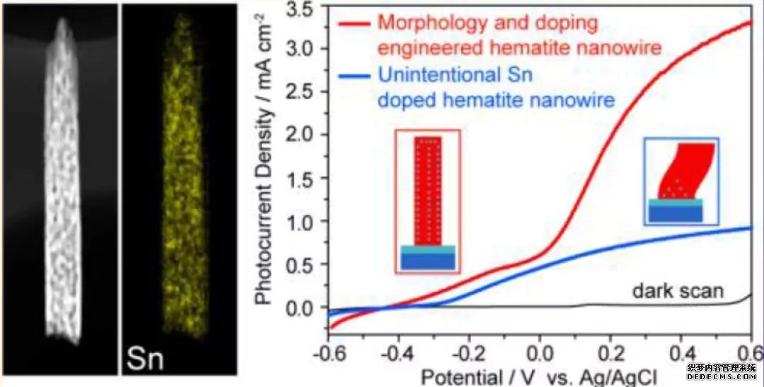 鄒志剛教授課題組通過水熱法制備了Ti4+摻雜的Fe2O3,并研究了Ti4+ 對(duì)Fe2O3結(jié)構(gòu)性能的影響。通過莫特肖特基譜,發(fā)現(xiàn)Ti4+摻雜對(duì)其帶邊位置沒有影響,但載流子濃度提升了1個(gè)量級(jí),這也是Ti4+摻雜能顯著提高Fe2O3光電流的主要原因。近年來除了Ti4+摻雜,Sn4+的摻雜也引起了廣泛的注意。(DOI:10.1039/C3CE26811J)