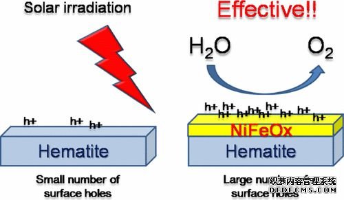 但目前在Fe2O3上降低開啟電勢(shì)有效的催化劑為NiFeOx。關(guān)于Fe2O3的開啟電勢(shì)差,Dunwei Wang課題組認(rèn)為是由于Fe2O3大量的表面態(tài)導(dǎo)致費(fèi)米能級(jí)釘扎,通過NiFeOx助催化劑的引入,大程度降低了表面費(fèi)米能級(jí)的釘扎效應(yīng),因此獲得了較好的開啟電勢(shì)。(上圖,DOI:10.1002/anie.201306263)