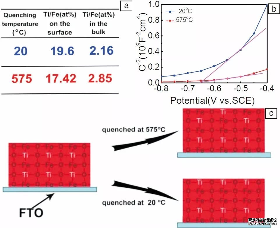 除了在材料制備后對(duì)表面偏析相進(jìn)行處理外,黃維院士團(tuán)隊(duì)對(duì)Fe2O3的煅燒過程進(jìn)行改進(jìn),發(fā)現(xiàn)通過短時(shí)間淬火的方式,能夠在制備過程中就降低表面的偏析、提高體相摻雜濃度,從而提高Fe2O3電的性能。XPS表征發(fā)現(xiàn),通過短時(shí)間高溫淬火可以有效降低Fe2O3表面的Ti偏析, 莫特肖特基曲線也發(fā)現(xiàn)高溫淬火后的載流子濃度相比于 常溫取出的Fe2O3高了6 倍,因此他們認(rèn)為高 溫淬火的方式可以將摻雜離子固定在材料晶格內(nèi)部,防止向表面偏析,從而減小表面復(fù)合,提高材料光電化學(xué)性能。(上圖,DOI:10.1002/cnma.201600108)