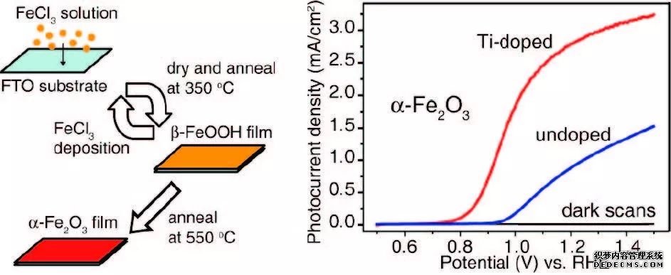 Michael Grätzel課題組在JACS發(fā)表的一項(xiàng)工作中,通過800 ℃高溫煅燒的方式,無意中將襯底FTO中的Sn摻雜進(jìn)了Fe2O3,使Fe2O3在1.23 V RHE 處的光電流由10 μA·cm-2提高到了0. 56 mA·cm-2。(上圖,DOI:10.1021/ja101564f)