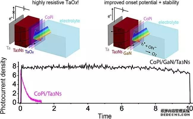 通過在Ta3N5表面用ALD制備一層致密的MgO層,將其表面與水及富氧物質(zhì)隔開。通過引入MgO層,Ta3N5光電不但穩(wěn)定性得到了較大的提升,其光電流曲線的填充因子也得到了提升,表明載流子的表面復(fù)合也得到了抑制。 (上圖,DOI:10.1016/j.chempr.2016.09.006)