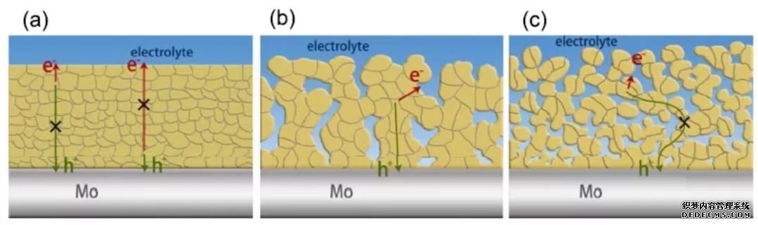 多孔結(jié)構(gòu)的BiVO4電由于減少了反射和透射,對(duì)光的吸收要高于平板結(jié)構(gòu)電。 此外,多孔結(jié)構(gòu)減少了光生空穴的傳輸距離,提高了光生載流子的分離效率,使光電流相比于致密電有了明顯的提高。但多孔結(jié)構(gòu)的光電也不是孔越多越好。 (上圖,DOI:10.1002/aenm.201301785)