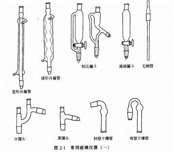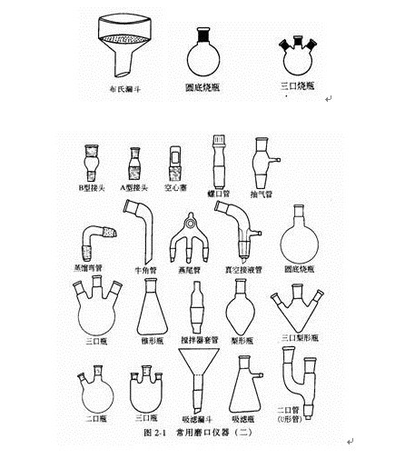 在精細(xì)有機(jī)合成實(shí)驗(yàn)中使用的一般為標(biāo)準(zhǔn)磨口玻璃儀器。它的用途、容量不同,應(yīng)注意標(biāo)準(zhǔn)磨口有不同的編號(hào),如 10 號(hào)、 14 號(hào)、 19 號(hào)、 24 號(hào)、 9 號(hào)和 34 號(hào)等。這些編號(hào)是指磨口大端的直徑 ( 單位為 mm ,取接近的整數(shù) ) 。洗滌磨口時(shí)不得用粗糙的去污粉,以免使磨口擦傷而漏氣。進(jìn)行真空減壓操作時(shí),磨口處應(yīng)涂以真空潤(rùn)滑脂,以免漏氣。一般用途可不涂潤(rùn)滑脂,以免砧污反應(yīng)物或產(chǎn)物。若反應(yīng)中有強(qiáng)堿,則應(yīng)涂潤(rùn)滑劑,以免磨口連接處因堿腐蝕粘牢而無(wú)法拆開(kāi)。精細(xì)合成實(shí)驗(yàn)所需常用玻璃儀器見(jiàn)圖 2-1 。